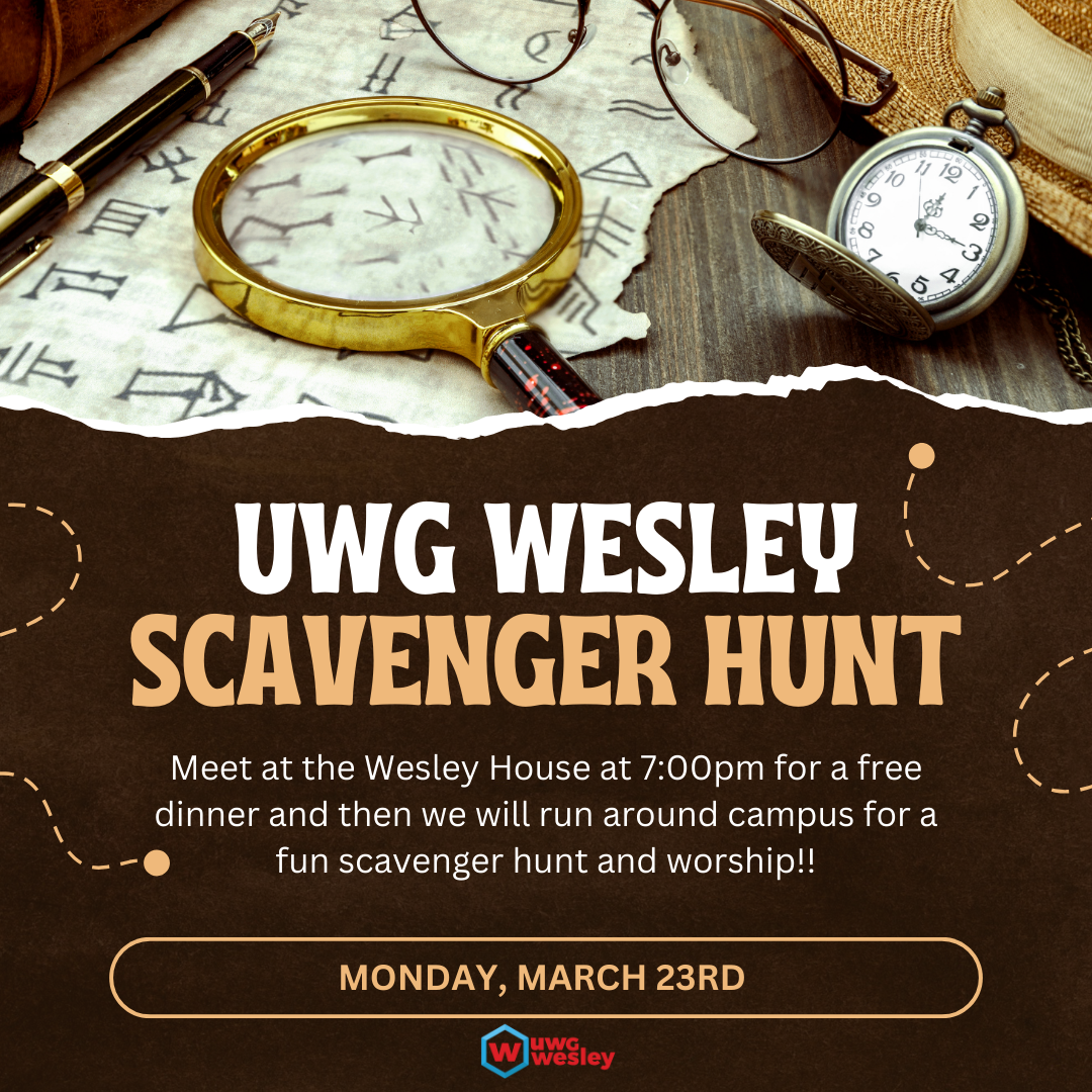 Think you have the skills to decipher clues? Join us on March 23rd at the Wesley House for a free dinner and then head out on campus for a competitive scavenger hunt, followed by worship at a secret location! Dinner at 7:00! Hunt at 7:30!